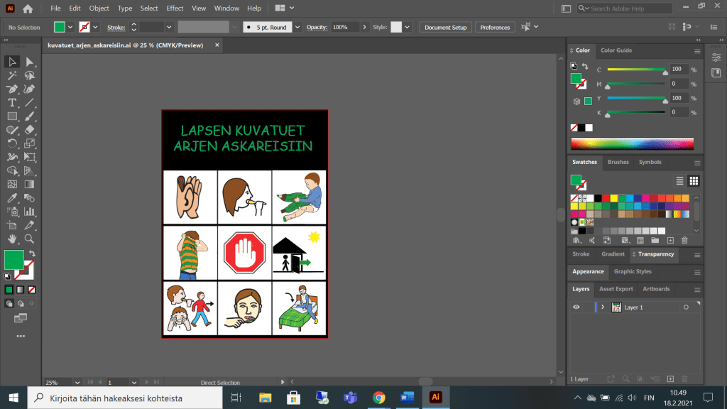 Itselleni harjoitustehtävä oli siinä mielessä opettavainen, sillä huomasin ja muistin, kuinka puuttelliset Illustrator-taitoni ovatkaan eli esim. jos olisin piirtänyt nuo kaikki korteissa olevat kuvat itse Illustartorissa, niin tekisin niitä varovaisesti arvioiden vielä varmaan parin viikon päästäkin… Tästä syystä katsoin muutaman YouTube-tutorialsin ja ryhdyin tekemään Illustratorilla kuvioita Pen tool-työkalulla. Tässä pari linkkiä katsomiini tutoriaaleihin: Infografiikkaa, lohkottu piirakkamalli, kivannäköinen infografiikka jossa vertaillaan kiinalaisia ja brittiläisiä naisia, Pen Tool aloittelijoille (sisältää harjoituksia).