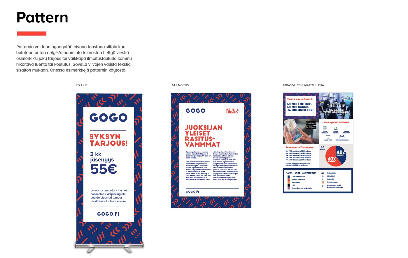 Itse ohjeisto on myös pakattu selkeään sähköiseen kansioon, josta löytyvät erikseen nimettyinä mm.: GOGO graafinen ohjeisto (sisältäen värikoodit, kuvaesimerkit yms), GOGO-erikoismerkit, pattern-pohja, fontit sekä logot erilaisissa muodoissaan. Graafisesta ohjeistosta löytyy myös hyviä kuvasarjoja, miten ohjeistusta on ajateltu käytettävän käytännön eri sovelluksissa. Alla esimerkit logon ja pattern-pohjan käytöstä:
