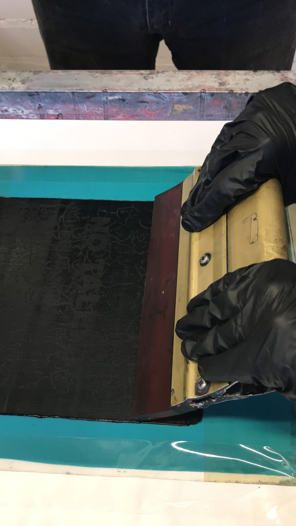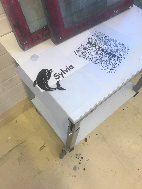 Kuvassa vaiheita seripainosta. Oikealla reunassa valmis painotyö: kangaskassi, jossa seripainomenetelmällä käsin painettu kuva. Seripainosta löytyy erillinen blogikirjoitus täältä.